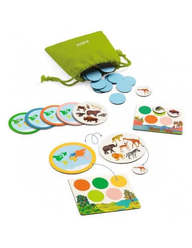 Animo Mondo de la collection "Cool School" de Djeco, un jeu de loto dans lequel les enfants de 5 à 10 ans vont apprendre à localiser les animaux du monde sur les continents de notre planète.