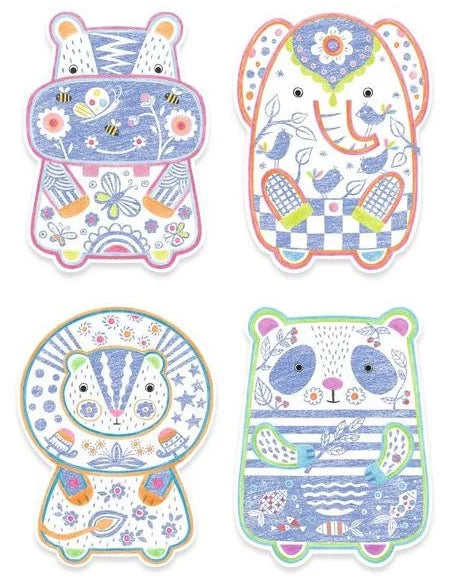 Une pochette de 12 images à colorier avec un gros crayon de couleur, adapté pour les petits enfants. L'enfant colorie les animaux sauvages à l'aide du crayon pour découvrir ce qui se cache. C'est magique : le crayon ne marque que sur certaines zones, des motifs apparaissent et révèlent des surprises !