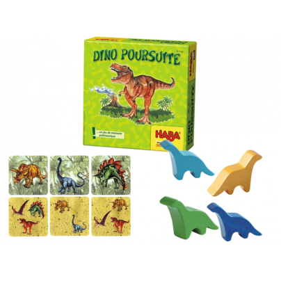 Jeu de mémoire 1. On place les 5 cartes de dinosaures en ligne sur la table faces cachées. 2. Chaque joueur à son tour retourne une carte de recherche contenant 3 de ces dinosaures et doit alors retourner les 3 dinosaures indiqués par la carte de recherche. 3. S'il y parvient sa figurine dinosaure avance d'une case sur le chemin. La règle est évolutive