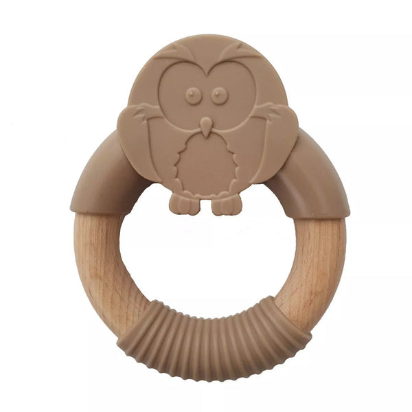 Anneau de dentition en bois et silicone facile à tenir pour l'enfant et agréable à mâcher lors des poussées dentaires.