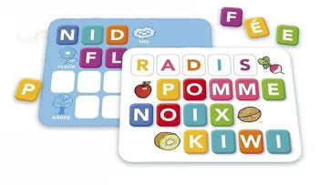 Un Jeu d’association dans lequel l’enfant reconnaît les lettres et compose ses premiers mots . L’enfant complète les planches avec les jetons « lettre », chaque lettre à sa couleur et chaque mot son dessin.