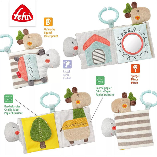 Amis câlins dans un livre en tissu passionnant : Hippo Loopy et la girafe Lotta de la collection Loopy & Lotta, avec la maison et l'arbre, vous invitent à découvrir, rechercher et ressentir sur 6 pages. Les grincements, le bruissement du papier, les miroirs et les têtes 3D passionnantes évoquent un sentiment d'émerveillement sur le visage de bébé et favorisent les premiers exercices de préhension, le sens du toucher et contribuent au développement positif de la perception de l'ego. L'anneau de fixation du livre d'images permet de le fixer facilement et en toute sécurité au siège bébé, à la poussette, au lit bébé ou dans la voiture. Pour s'amuser à la maison ou en déplacement !