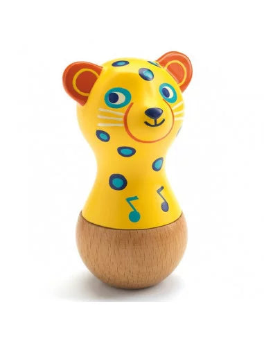 Le maracas jaguar de la collection Animambo deDjeco. Un instrument de musique en bois, facile à attraper et à manipuler pour les bébés dès 12 mois, un joli jaguar à secouer.