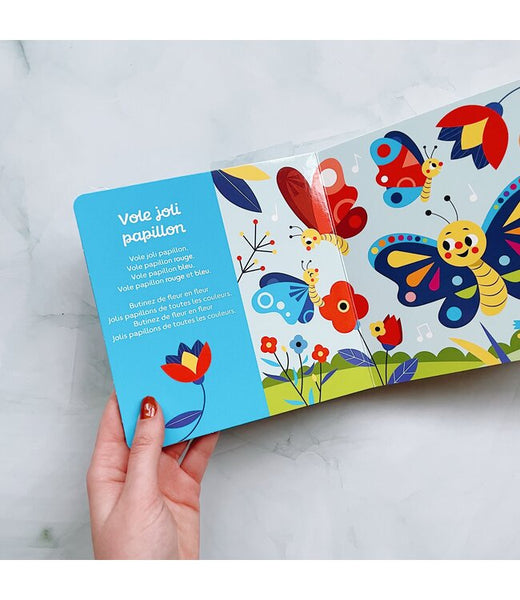 Un livre musical à mettre entre les mains des enfants en toute autonomie ou à partager joyeusement. En appuyant sur les puces sonores, votre enfant pourra écouter "Mon âne", "La chanson des couleurs", "Coccinelle demoiselle", "Vole joli papillon", "Éléphant blanc" et "Petite poule grise".