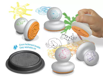Un pack contenant 5 tampons en mousse et un encreur maxi format. La poignée ronde facilitera la prise en main. Ce coffret permettra aux tout-petits de découvrir le plaisir du tampon tout en les aidant à développer leur motricité fine.
