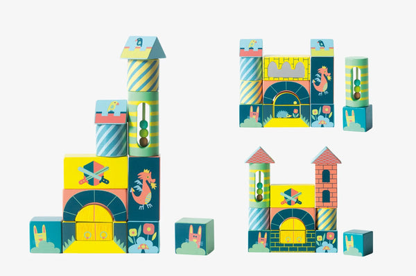 14 éléments en bois dont 6 cubes sensoriels à assembler pour former une multitude de châteaux de toutes les tailles et de toutes les formes. Eléments sensoriels : 4 cubes sonores à agiter, 1 miroir, 1 boulier de 3 billes