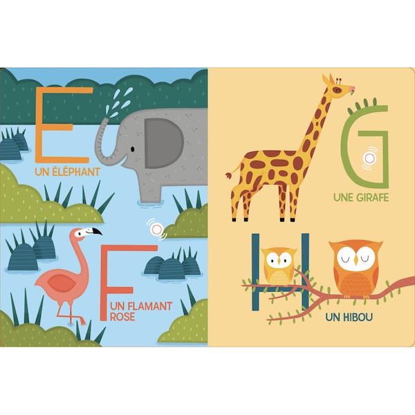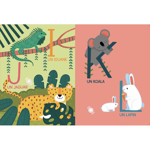 À chaque page, une puce sonore permet d’écouter la lettre et le nom de l’animaux lus à voix haute.