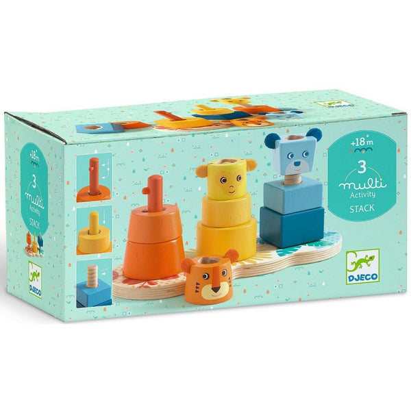 Multi Stack est un jouet d'éveil en bois qui fait découvrir à l'enfant 3 manières différentes et rigolotes d'empiler des formes. Chaque pyramide est un animal de couleur différente: 1 ours bleu, 1 singejaune et 1 lion orange. Et chaque axe demande un geste différent: l'enfant empile sur l'axe lisse, il visse sur l'axe en spirale et il pivote sur l'axe à clé.