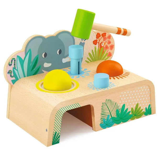Multi Tap est un jouet en bois qui permet à l'enfant de découvrir 3 manières différentes de taper avec un marteau. Il tape sur la boule, qui ressort par la porte. Il tape sur un cylindre bleu, ce qui fait ressortir l'autre. Et il tape sur le champignon, qui fait un bruit de pouet.