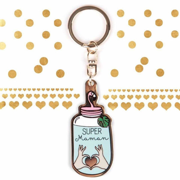 Découvrez le porte clé Super Maman de CréaBisontine, un magnifique porte-clés émaillé monté sur un métal doré, un cadeau à offrir à sa maman afin qu'elle accroche ses clés de maison ou de voiture. Un petit cadeau en forme de bocal sur lequel est inscrit Super Maman, une attention qu'elle conservera longtemps et qui la touchera en plein coeur.