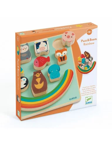 À la fois puzzle d'encastrement et jeu d'équilibre, ce jouet amusera beaucoup les filles et les garçons. Après avoir retrouvé la place de chaque pièce sur le plateau en bois, l'enfant pourra s'amuser à placer délicatement les animaux en équilibre sur l'arc-en-ciel pour former une pyramide... en tentant de ne rien faire tomber!