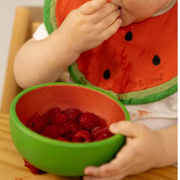 un set de vaisselle unique pour les tout-petits à table. Il se compose d’un bol et d’une cuillère fabriquées à la main en bois d’hévéa.