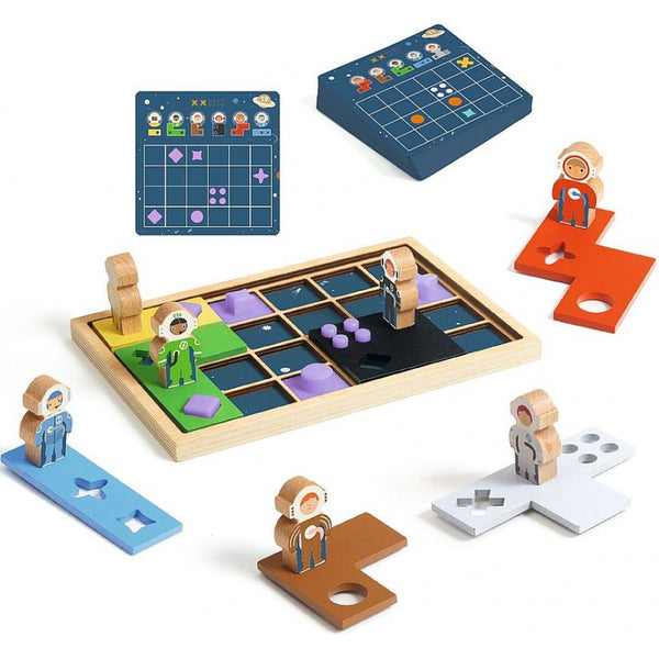 Jeu de logique pour arrimer chaque astronaute à une station spatiale. On sélectionne un défi qui indique les stations spatiales en jeu et où les placer sur la grille, ainsi que les cosmonautes concernés. Il s'agit alors de placer chaque personnage sur la grille de sorte à les arrimer chacun à une station. Les défis sont de plus en plus compliqués, avec un plus grand nombre de stations et de cosmonautes, mais il n'y a toujours qu'une solution par défi! Un joli jeu de logique progressif qui rejoint la collection Sologic, avec 60 défis et 4 niveaux de difficulté, pour travailler le repérage spatial et la résolution de problèmes.