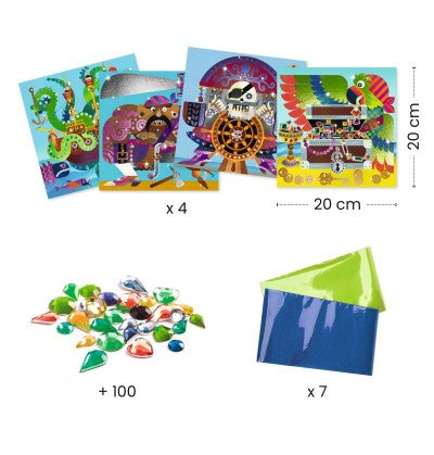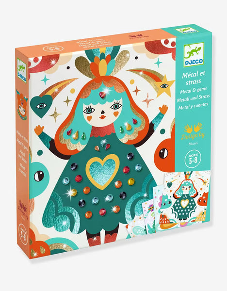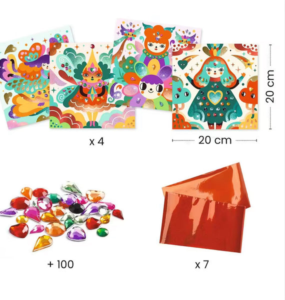 Une activité de collage pour décorer 4 tableaux avec des feuilles métallisées et strass. Grâce au code couleur indiqué sur les planches, l'enfant repère les zones à métalliser. À l'aide de l'outil, il dévoile la pellicule protégeant la surface encollée, puis y dépose la feuille métallisée. La matière se dépose comme par magie ! Il colle ensuite les strass et les tableaux s’illuminent.