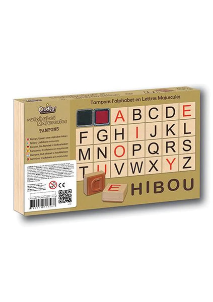 Ce grand coffret en bois contient : 26 tampons en bois sérigraphiés avec les lettres de l'alphabet en lettres majuscules et 2 encreurs.