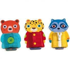 Le jeu de manipulation Ziptou de Djeco, un coffret avec 3 animaux en bois avec chacun un vêtement en tissu à fermer pour les enfants à partir de 3 ans. Votre enfant va exercer sa motricité en fermant la veste à bouton de l'ours, en glissant la fermeture à glissière du raton laveur et en fermant les boutons pressions du léopard.